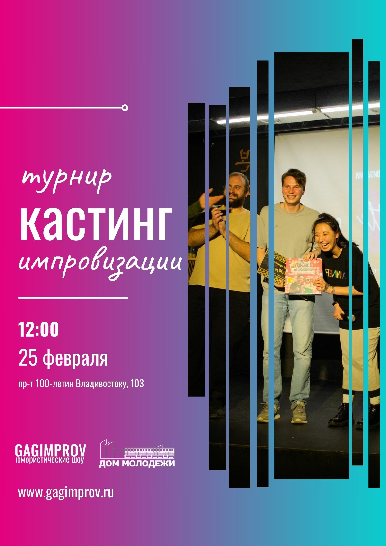 Что будет на Школе-кастинге? Мы покажем как играть форматы баттловой импровизации, которые будут в Турнире. По итогу будут отобраны от 4 до 8 команд, которые пройдут для участия в осеннем Турнире импровизации. Нет своей команды или считаешь, что не готов к турниру? Приходи и найди себе команду прямо тут. Мы будем рады видеть абсолютно всех! Участие в Школе-кастинге и в последующем Турнире — бесплатное. |