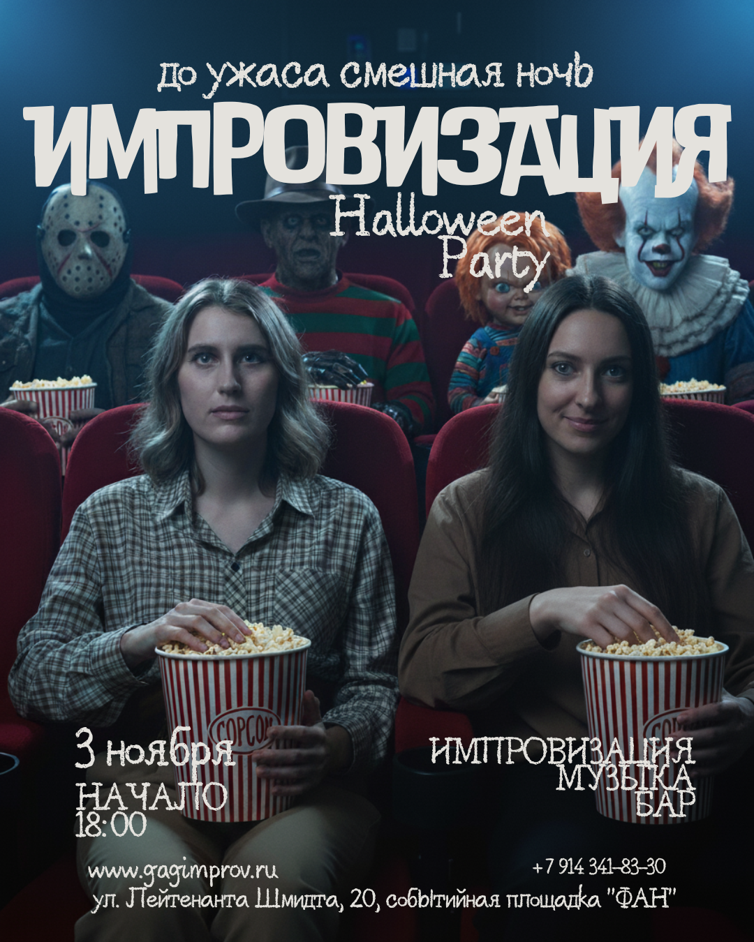 | Программа На вечеринке ты станешь импровизатором и выйдешь на сцену под руководством опытных комиков. В программе: нетворкинг, мастер-класс по импровизации, выступления на сцене в формате импровизации. Halloween Импровизация является частью праздничной вечеринки. Вы можете купить билеты на остальную часть программы: - 18:00 Halloween Импровизация - 21:00 Halloween Stand Up - 22:30 Диджей, музыка (вход свободный) |